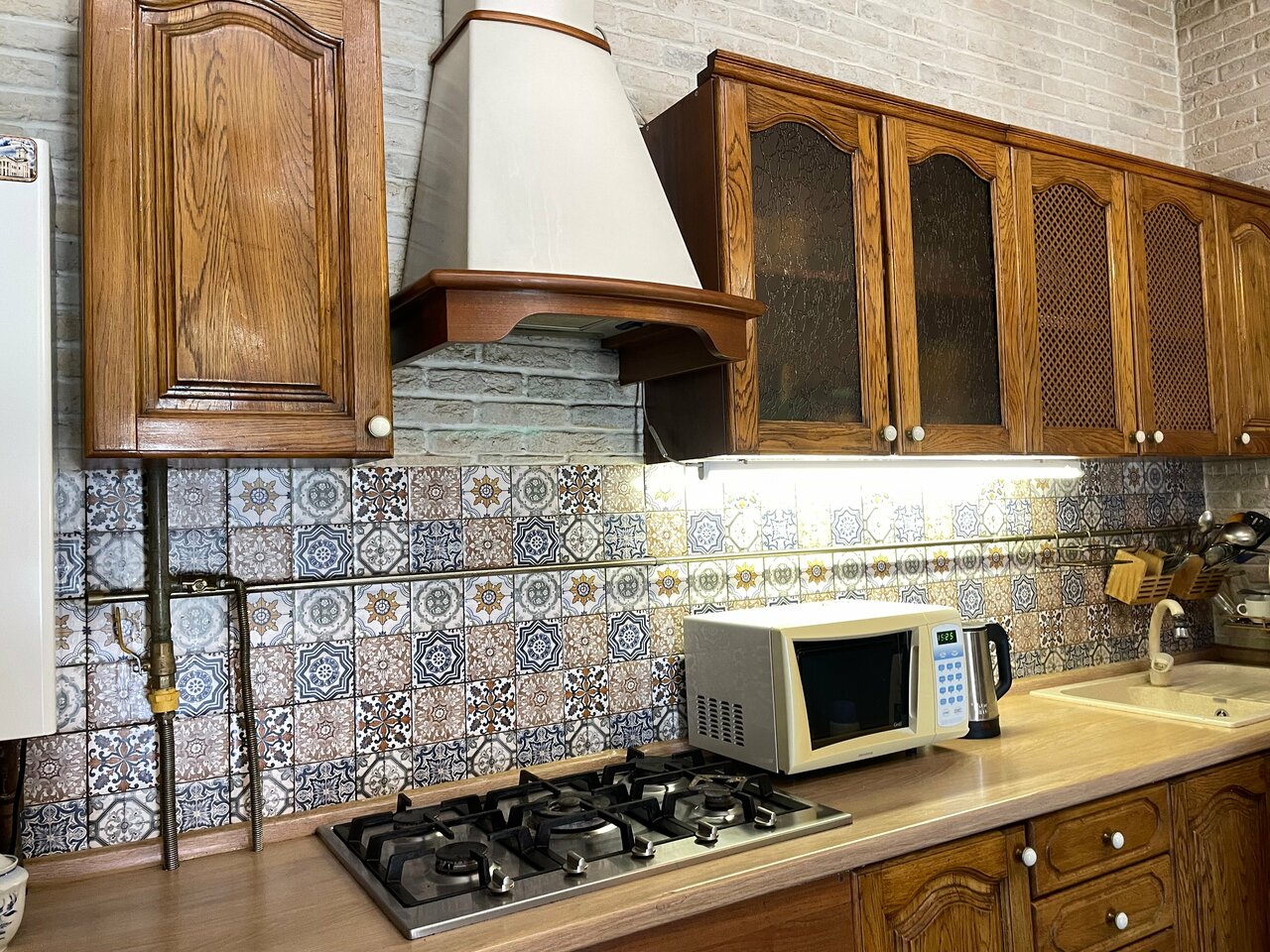 Также представлены фото общественных зон: оборудованной кухни, где гости могут готовить, уютной мангальной зоны на свежем воздухе и беседки — мест для отдыха и общения. Отдельно мы показываем виды из окон и дворовую часть, природу вокруг, чтобы вы ощутили атмосферу умиротворения и покоя, которая здесь царит.